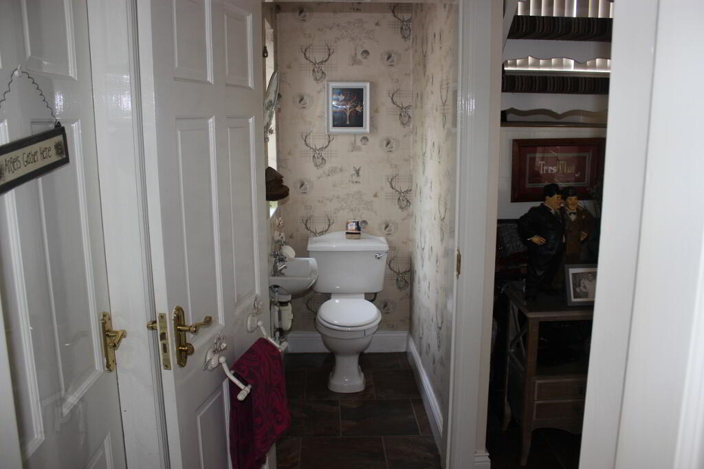 Downstairs Toilet (1.35 x 0.84m) - laminate flooring, WC, WHB in white suite