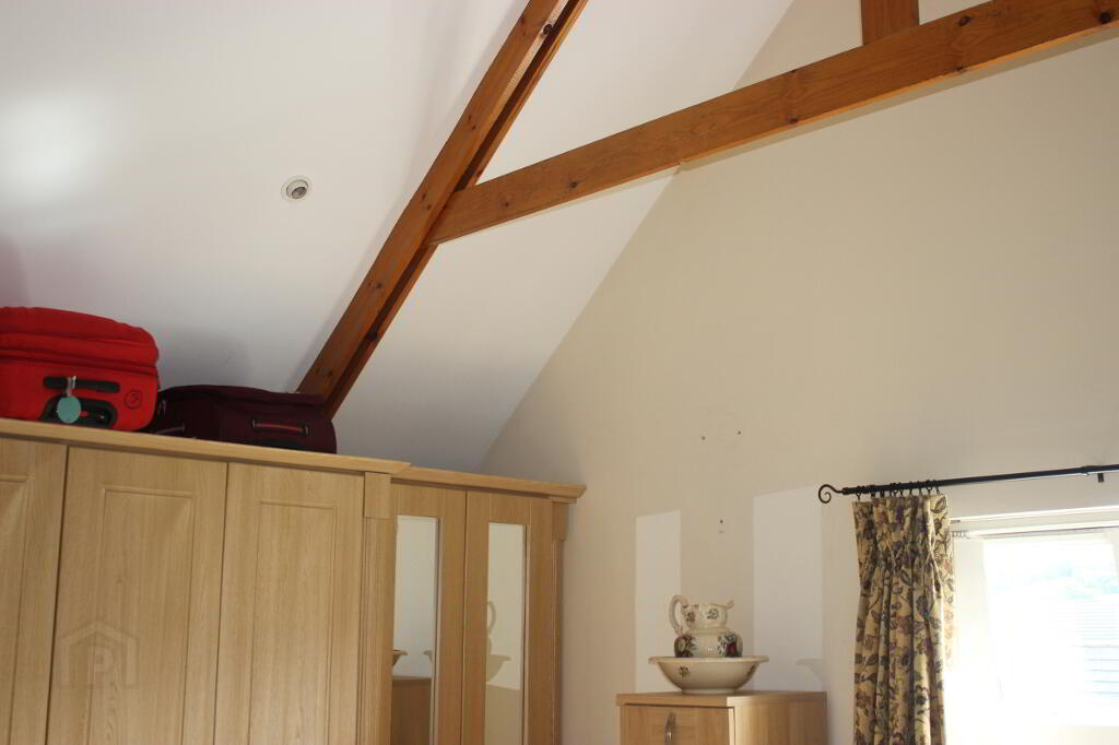 Master Bedroom (5.37 x 4.81m) - Full wall built in fitted wardrobes with matching dressing table, feature exposed ceiling beams, spotlighting, laminate flooring including En-suite (1.72 x 1.67m) with quadrant shower cubicle - redring electric shower, WC, WHB in white suite, tiled flooring, half panelled walls with feature pebble tile border, spotlighting, velux ceiling window.